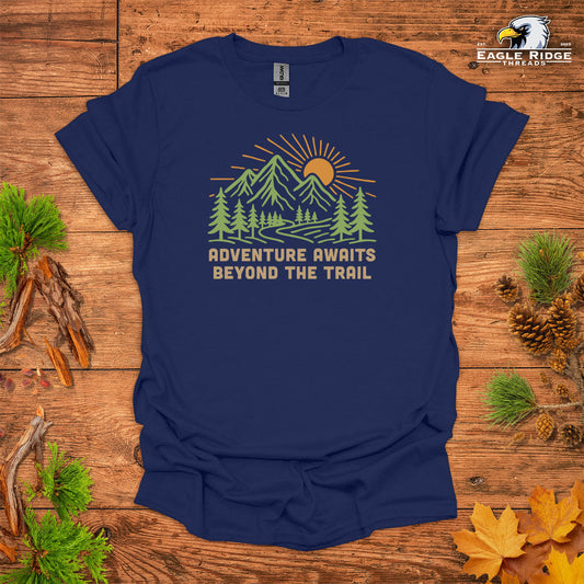 Adventure Awaits Beyond The Trail • Hiking T-shirt • Mountain Sunrise Graphic